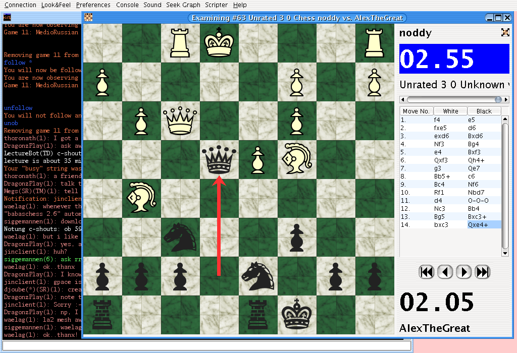 Jin's board in examine mode on FICS under GNU/Linux with the Liquid look and feel. The board uses a green marble pattern and the Condal piece set. |