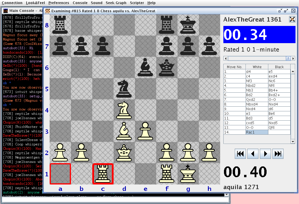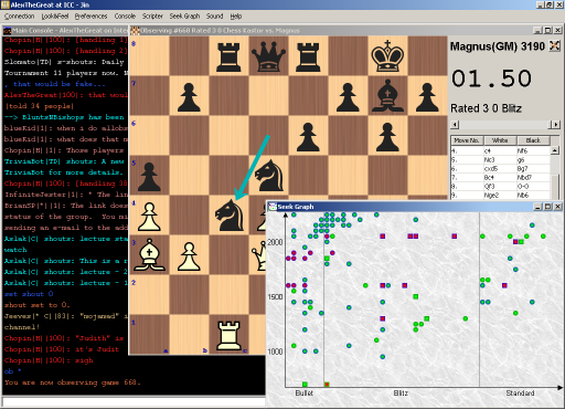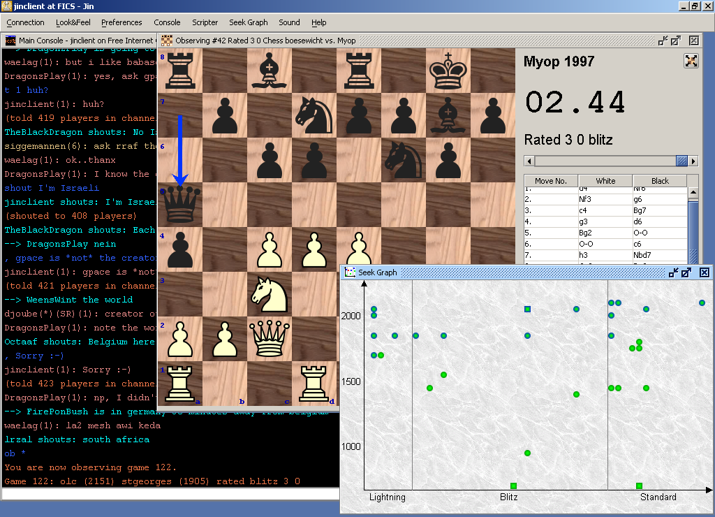 Jin's main window on FICS under Microsoft Windows with the Plastic XP look and feel. The board uses a pale wooden pattern and the Merida piece set. |